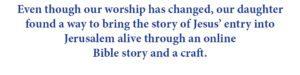 With the service ended I checked my phone messages. My daughter had sent pictures of our grandchildren doing potato print crafts. Do you remember doing those as a child? Tears came to my eyes as I saw prints of palms on the potatoes. Even though our worship has changed, our daughter found a way to bring the story of Jesus’ entry into Jerusalem alive through an online Bible story and a craft. Lord, wonderful are your works! The Holy Spirit, planted in my daughter’s baptism, has helped her grow and she, in turn, is nurturing that Holy Spirit planted in her children.